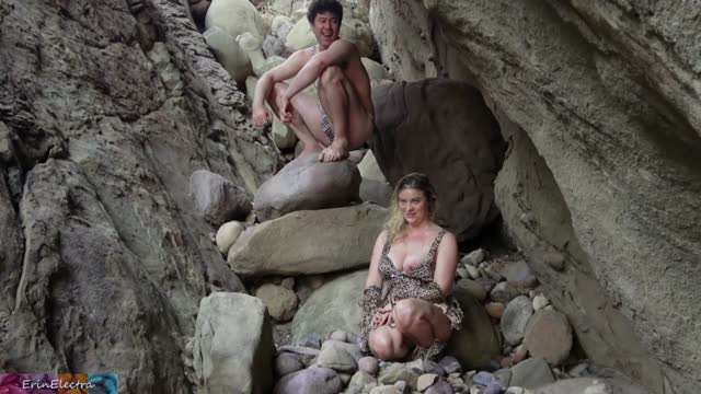 和继母的户外活动在大石头旁